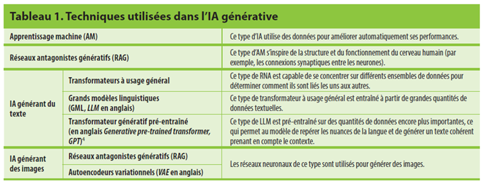 Tableau 1. Techniques utilisées dans l’IA générative (Unesco, 2024)