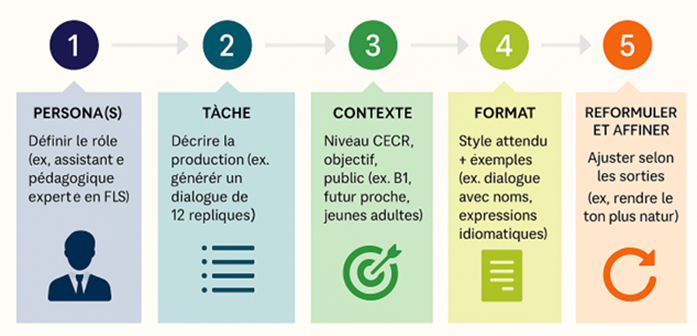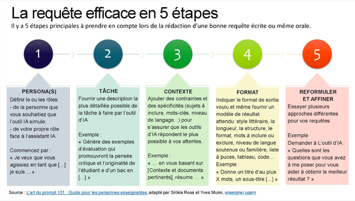 Pour celles et ceux qui n’ont pas tendance à utiliser des outils d’IA, en particulier Microsoft Copilot, ou qui n’ont pas encore maîtriser l’art du prompt, l’Université d’Ottawa offre des recommandations pour la composition des requêtes. Vous pouvez aussi faire appel au processus en 5 étapes :