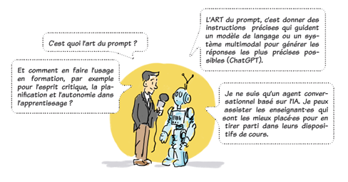 Le prompting consiste à formuler une requête claire et contextualisée (niveau, objectif, public, format) pour obtenir une sortie utile. Les cadres issus de la formation des enseignant.e.s insistent sur la clarté, la structure et l’itération, ainsi que sur la sécurité des données (Vangrunderbeeck, 2024; Nouveau-Brunswick, 2024).
